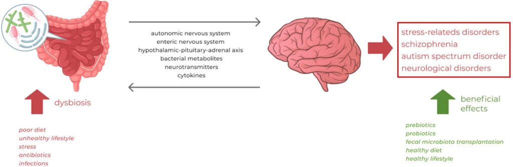 Il sistema nervoso centrale e l’intestino comunicano tra loro utilizzando una serie di meccanismi di segnalazione chimica, comprese le vie neuronali, immunitarie ed endocrine dirette. Oltre al sistema neurologico, il microbiota intestinale influenza il cervello attraverso i sistemi endocrino, immunologico e metabolico. Sono proprio i microbi dell’intestino a determinare, in parte, il modo in cui il sistema nervoso si sviluppa, matura, invecchia e mantiene l’omeostasi. I principali modi in cui il microbiota può influenzare lo sviluppo e il funzionamento del sistema nervoso sono la trasmissione diretta e indiretta